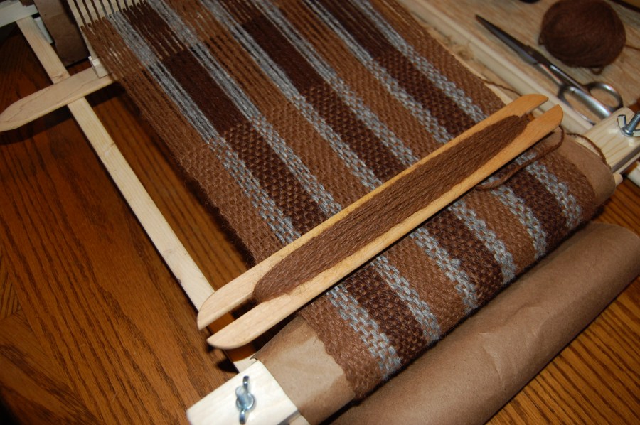A handwoven scarf in progress on the loom.